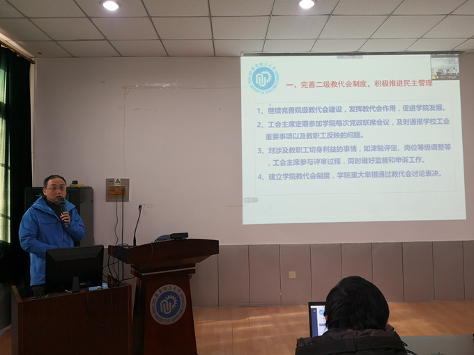 侯峰作365英国上市网站官网第四届工会工作报告,分别从教代会履职、工会活动组织、教职工关爱以及工会今后的工作思路和重点工作等方面对学院工会工作进行了梳理和总结,并向大会汇报了学院工会经费的收支情况。