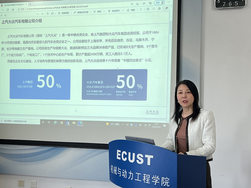 王红艳介绍了公司的发展历程、2025战略、目前的业务模块以及人才发展双通道模式,表示今年公司的校园招聘岗位将瞄准企业战略,力争实现从产品到运营端口人才技能的转移升级,并表达了公司希望未来在汽车数字化、智能制造领域达到行业领先地位的愿景。她还介绍了公司往年在华理的校招情况,希望未来能够在项目合作、人才招聘、人才培养方面进一步加深校企合作的深度和广度。