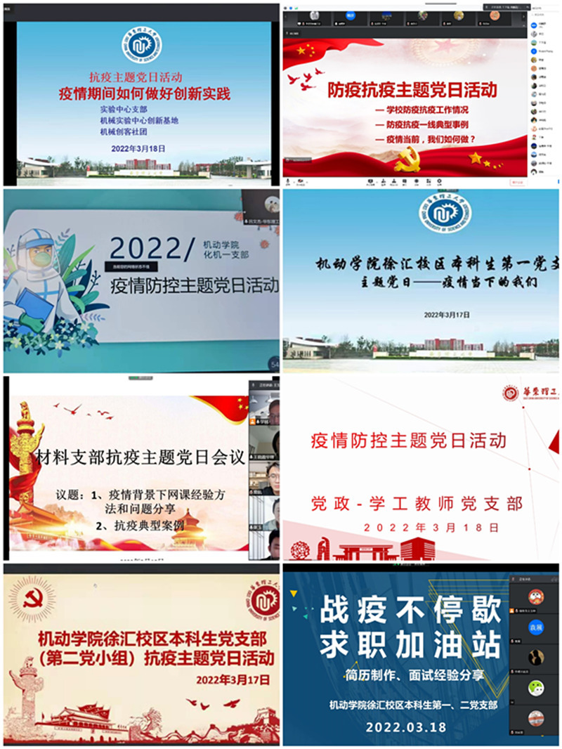 学院实验中心党支部老师联合创新基地和机械创客社团36位骨干学生,线上指导学生如何在疫情期间做好创新实践活动,做到“疫情防控不放松,创新实践不断线”;材料党支部老师就关于如何提升网络教学水平、保证学生线上学习效果展开充分交流与研讨,保驾护航云教学;党政-学工教师党支部学习了李喜娜和黄泽炀等教师连续在校内参与一线抗疫工作、倾情服务师生、践行党员使命担当的精神;化工机械第一支部从服务于学生的角度出发,重点强调了疫情下导师做好与学生沟通工作的重要性,在做好疫情防控的同时做好重点学生的心理健康教育工作;徐汇校区本科生党支部通过分享求职、学习科研、运动生活等经验体会,减轻焦虑,并面向所有毕业班同学开展“战疫不停歇,求职加油站”交流会活动,通过辅导员、已签约同学分享制作简历、面试技巧等经验交流,助力大四同学求职就业。在疫情防控关键时期,本次疫情防控主题党日活动发挥了党支部的核心战斗堡垒作用,进一步彰显了党员的责任担当和无私奉献精神。