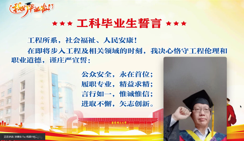 随后,由涂善东院士领誓,全体师生宣读了工科毕业生誓言,表示要保证工程造福人类,必须意识到工程存在风险,以人民的生命财产安全为重,谨记使命,恪守工程伦理和职业道德。学院在全国首倡工科毕业生誓言,历届毕业生牢记誓言,不忘初心,为祖国建设做出了重要贡献。